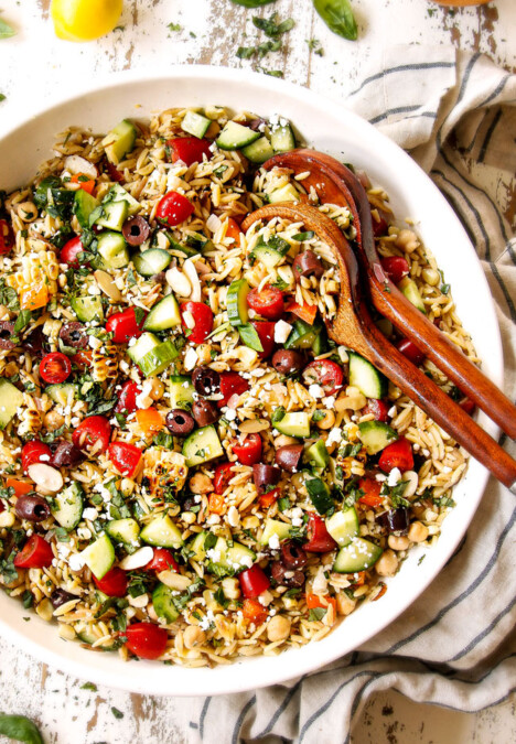 Greek Orzo Pasta Salad: light yet filling pasta salad loaded with al dente orzo pasta, crisp cucumbers, juicy tomatoes, crunchy bell peppers, charred, caramelized sweet corn, zippy red onions, tangy Kalamata olives, and salty creamy feta, all brightened by tangy, herb vinaigrette. Also make ahead friendly for the perfect stress-free win!