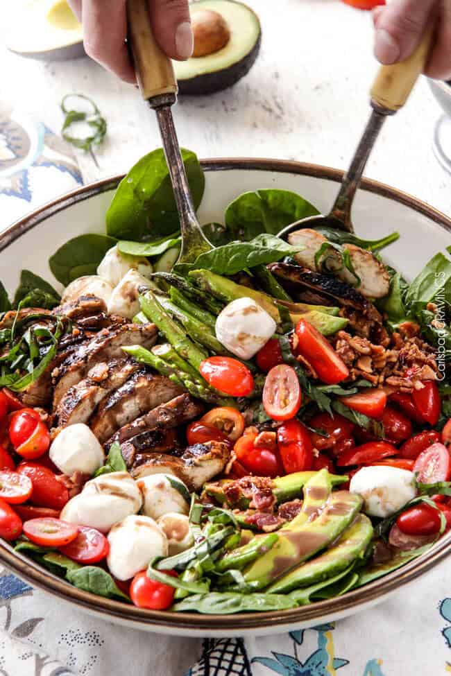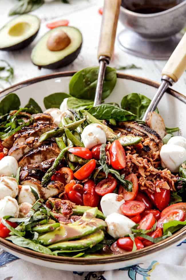 Chicken Caprese Salad with sensational balsamic marinated chicken, fresh tomatoes, melt in your mouth mozzarella, grilled asparagus, creamy avocado and crispy bacon all drizzled with Creamy Balsamic Reduction Dressing = Out of this world! This recipe will have you craving salad, dreaming about salad and not being able to stop eating salad! It is one of my favorite salads of all time and soon to be yours!