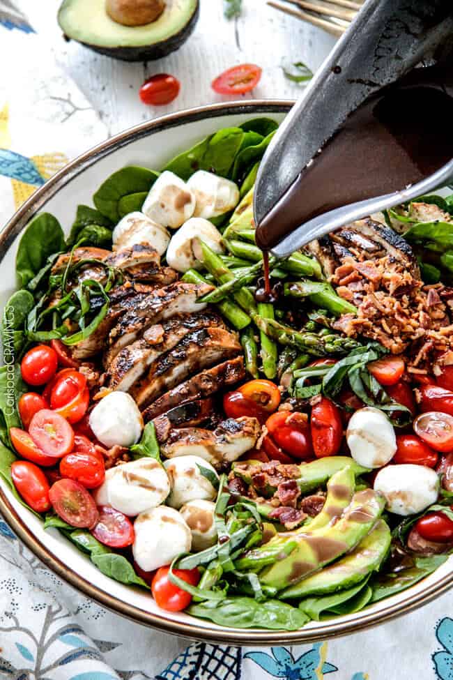 - Toss spinach, basil, asparagus, tomatoes and mozzarella in a large bowl. Top with chicken, bacon, and avocado. Drizzle individual servings with Balsamic Reduction Dressing.