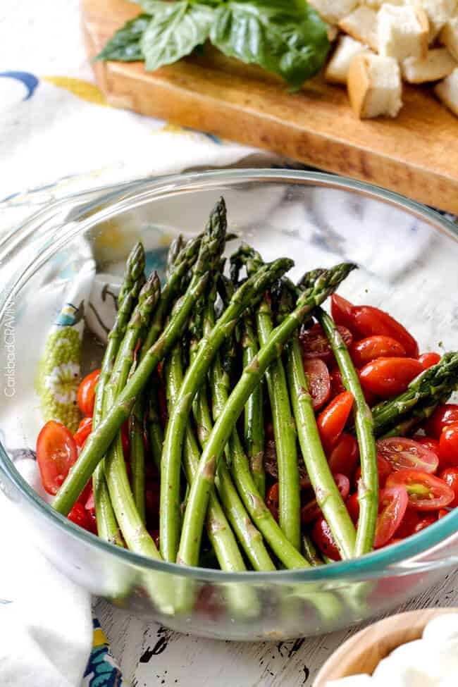 - Whisk together all of the Balsamic Marinade ingredients in a medium bowl. Remove 1 tablespoon and add to a large bowl along with tomatoes and asparagus. Toss evenly to coat. Refrigerate.