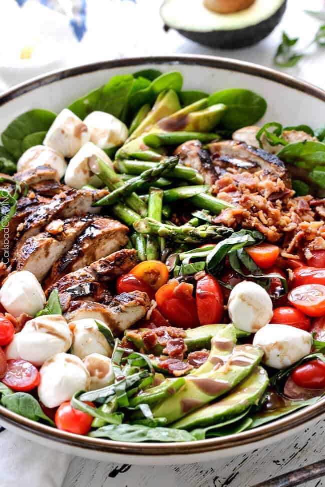 Caprese Chicken Salad with Asparagus, Avocado and Bacon. Because it’s grilling season, because every cart counts and because you deserve an insanely delicious salad!