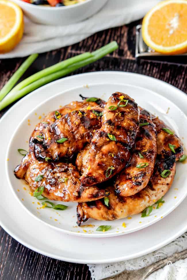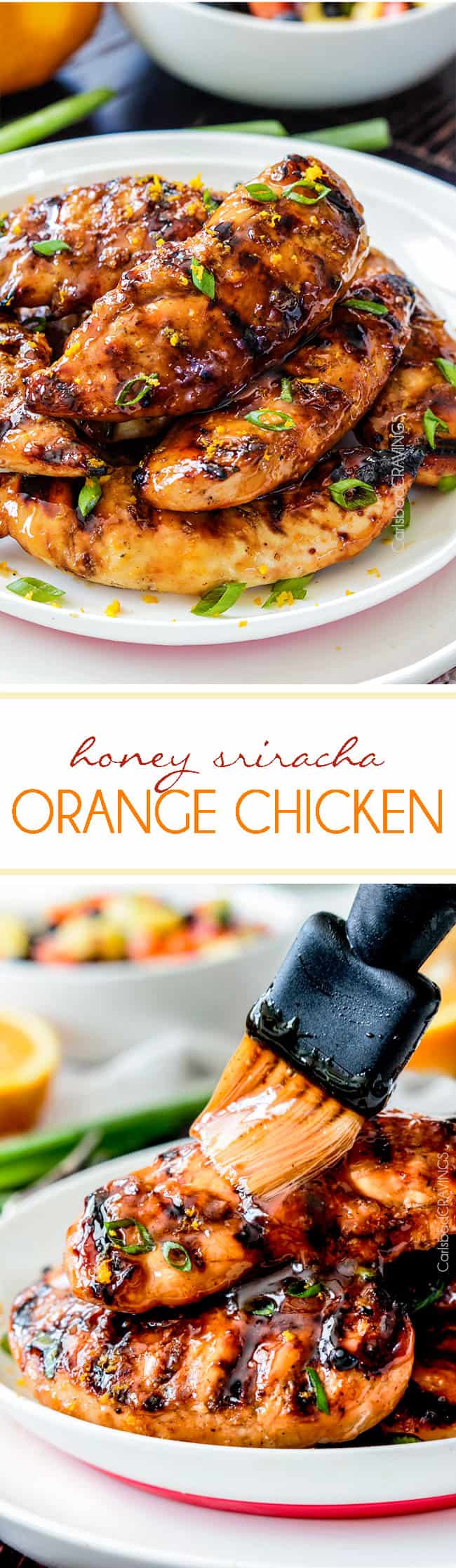This incredible juicy chicken is marinated then glazed in s a harmonious concoction of orange juice, orange marmalade, honey, and splashes of lemon juice, sriracha, hoisin sauce (like Asian BBQ sauce), ginger, garlic, etc. Mmmmmmm…..Can you taste it now?!