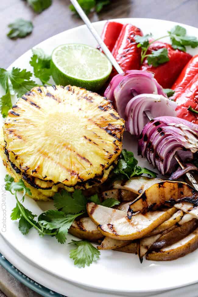 - Working in batches as needed depending on grill size, grill pineapple and vegetables at medium high heat (uncovered) until tender crisp and lightly charred all over, about 12 minutes for the onions, turning occasionally, about 8-10 minutes for the pineapple, or until caramelized, flipping once, 6 minutes for the red bell peppers, flipping once, 4 minutes for the pears, flipping once, and jalapeno for 3-5 minutes, turning occasionally.