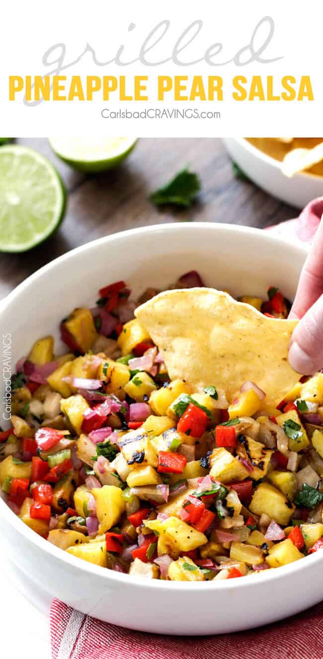 Sweet and smoky Grilled Pineapple Salsa! The combination of grilled pineapple, pears, red bell peppers, red onions AND jalapeno is out of this world!