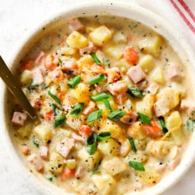 Super creamy. This Ham and Potato Soup recipe is mega creamy by combining a roux, half and half and the pièce de resistance, mashing some of the cooked potatoes directly in the soup! You’ll be in comfort food heaven.