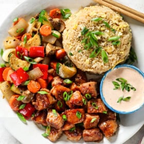 This Hibachi Chicken recipe is every bit as swoon worthy as Benihanas at a fraction of the price! The juicy, savory chicken is extra tender thanks to my “velveting” technique, the veggies are fresh, crisp tender and completely customizable, and the rice is buttery, umami fantastic with a kiss of toasted sesame oil. Marry the full-flavored trio together with creamy, tangy, slightly sweet and spicy Yum Yum Sauce and you can skip the takeout forever!