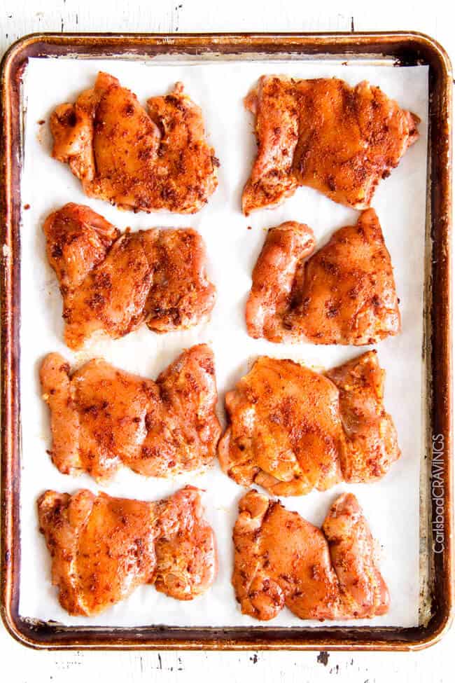 You will want to trim your chicken thighs of excess fat before smothering in the rub. I like to use my kitchen shears to make this super quick.