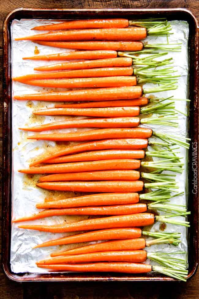 - Be flexible with baking times. I have made this recipe multiple times and the roasting time is always different because no batch of carrots is the same. The good news – carrots are not temperamental. If you undercook them – just pop back in the oven. If you overcook them slightly, they will just become more tender.