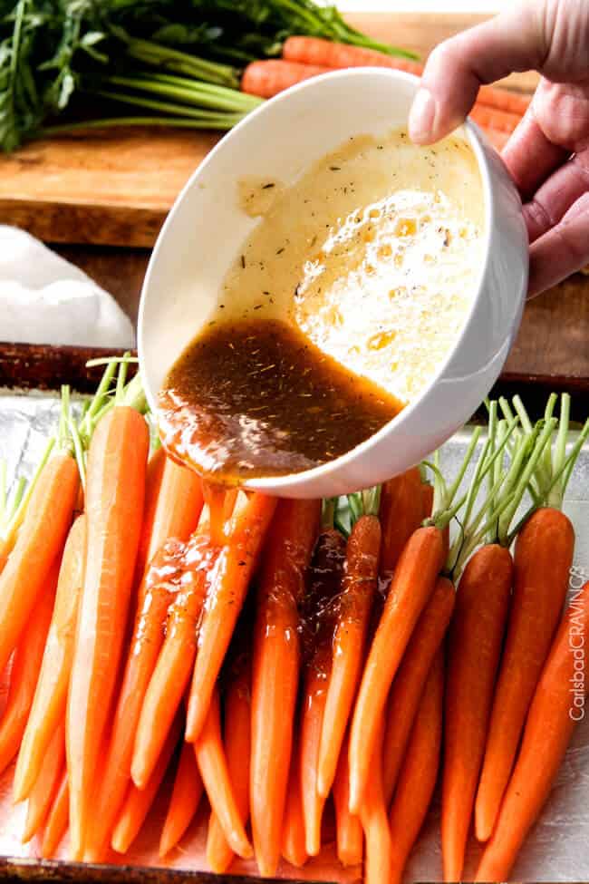 - Dijon Maple Butter Roasted Carrots: Roast carrots with olive oil, salt and pepper until tender, 35-45 minutes. Whisk together 1 tablespoon melted butter, 1 tablespoon balsamic vinegar, 2 teaspoons Dijon and 1 teaspoon pure maple syrup. Toss the roasted carrots with sauce once they’re tender.
