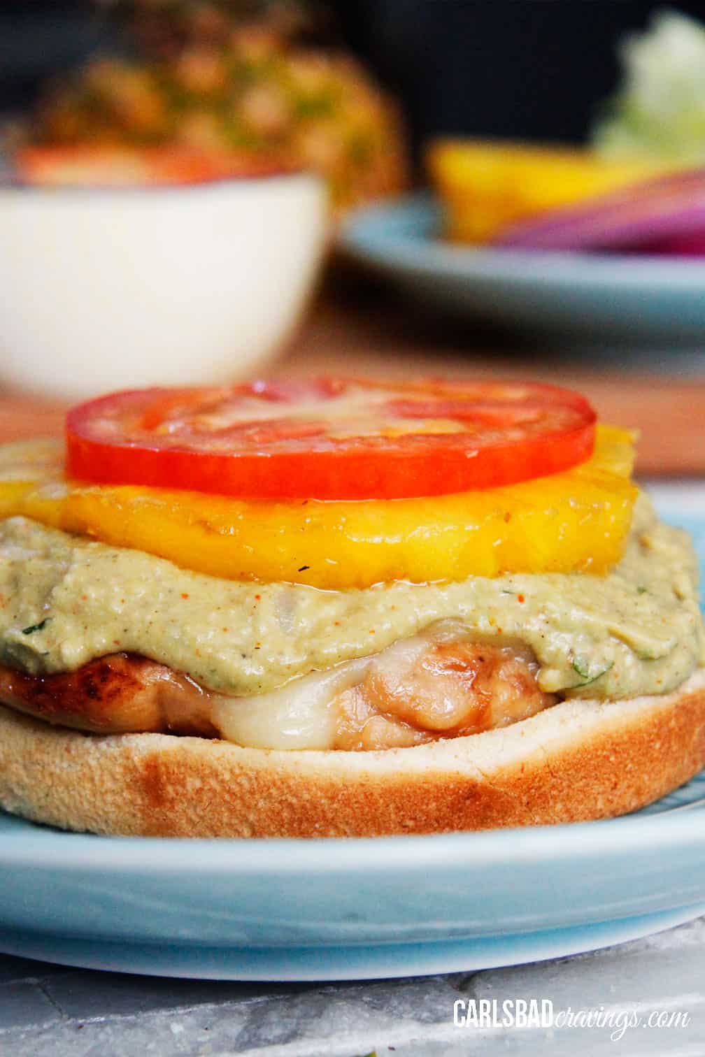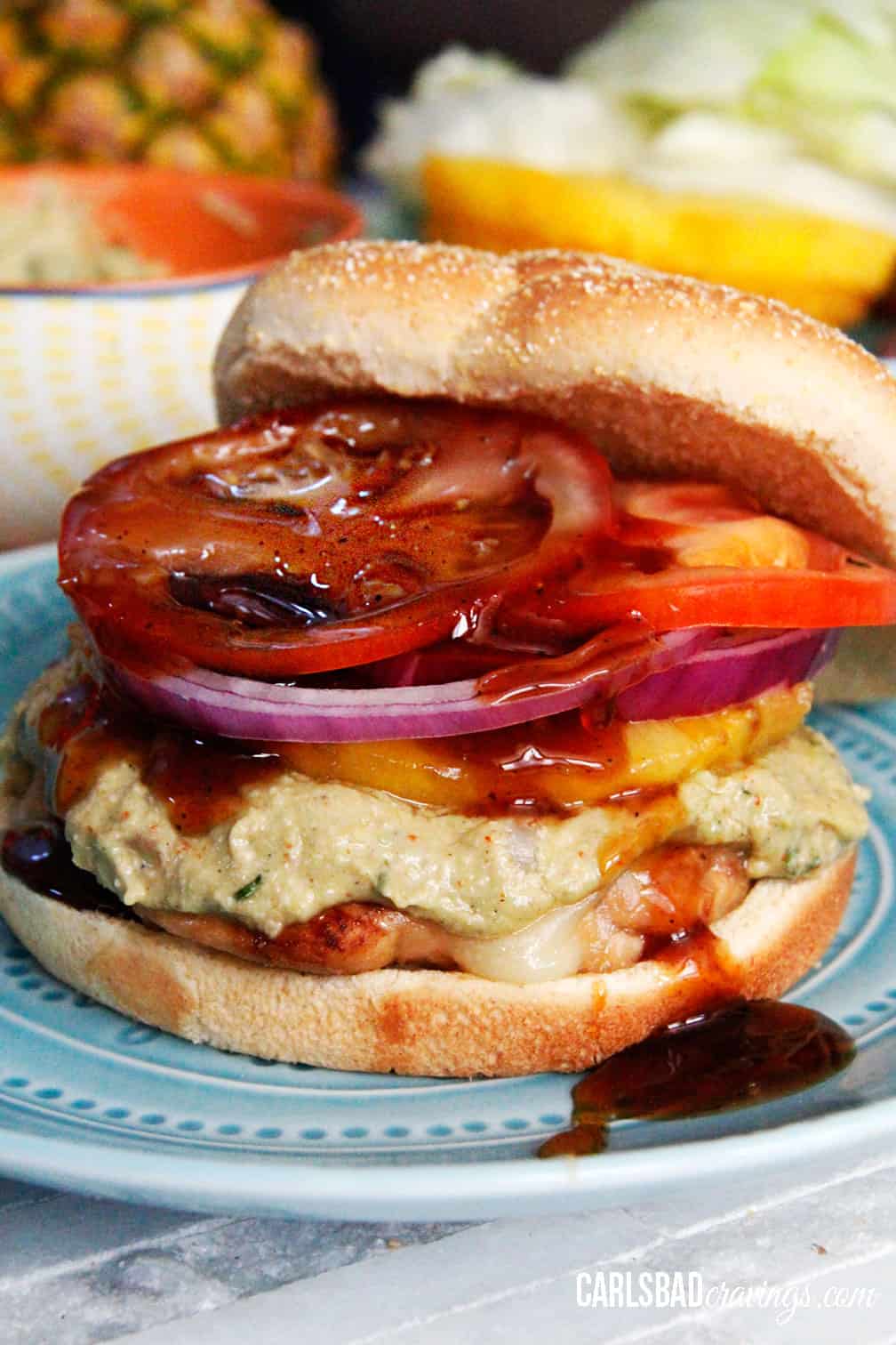 - To assemble, layer chicken covered in cheese, smear with Cotija Honey Lime Avocado Spread, then stack tomatoes, drizzle with Honey Teriyaki Sauce and finish topping red onions and lettuce.