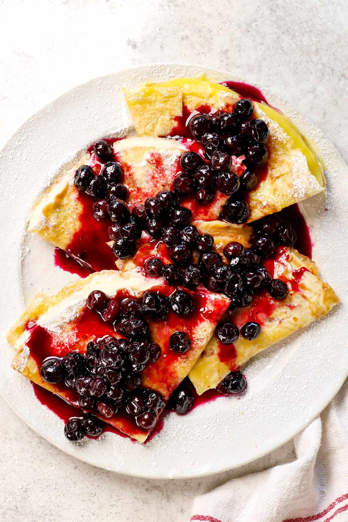 - Sweetened Cream Cheese Filling: Add the cream cheese to a large mixing bowl and beat until smooth using a handheld mixer. Add the remaining ingredients and beat until smooth. Refrigerate until ready to use. This filling is tasty with berries, berry syrups (pictured blueberry sauce), jams, powdered sugar, lemon juice, etc.