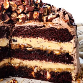 This Snickers-inspired ice cream cake is rich, creamy, chocolatey, and packed with the sweet-salty goodness of peanut butter caramel in every bite. It may look impressive, but the recipe is straightforward, tested, and foolproof, complete with step-by-step photos, expert tips, tricks, and easy variations. Best of all, it’s topped with stabilized chocolate whipped cream, so it freezes beautifully for weeks without losing its luscious texture—unlike other recipes that fall short, literally.