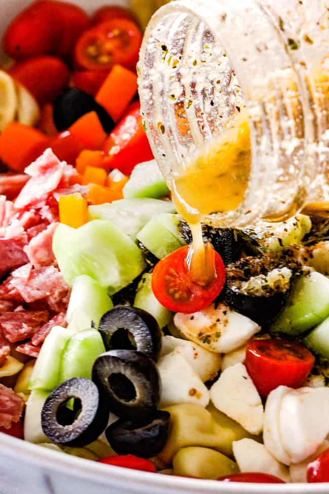 •After pasta is drained, immediately add it to a large bowl then toss it with half of the dressing. By tossing it with dressing while it’s still slightly warm, it soaks in even more zesty flavor and the dressing also keeps the tortellini from sticking together.