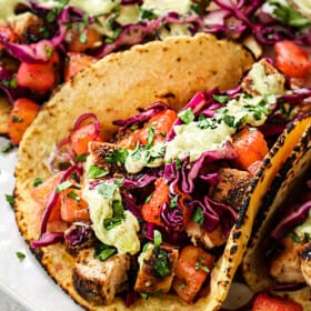 These Jerk Chicken Tacos are the tacos of your tropical dreams loaded with juicy, aromatic, earthy, sweet, smoky, spicy Jerk Chicken and sweet and crunchy pineapple slaw, drizzled with silky avocado jerk crema all cocooned in a warm corn tortilla. They are easy to make with a quick chicken wet rub while you prep the toppings, or they are entirely prep ahead friendly for a dinner that comes together in minutes. Pair them with Coconut Rice and Pina Colada Fruit Salad for a complete tropical feast!
