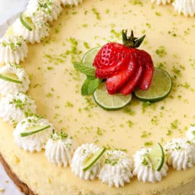I am not a huge fan of key lime pie in general but this cheesecake is fabulous! I made it for my SIL’s birthday and it was absolutely perfect! I candied some limes to decorate with the whipped cream topping and sprinkles of lime zest.