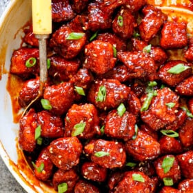 Yangnyeom chicken is a variety of Korean fried chicken coated in a bold, sweet, savory and spicy red sauce of gochujang, sugar, rice vinegar, garlic and ginger. The recipe I’m sharing with you today is a healthier, more approachable version of yangnyeom chicken, but every bit as delicious!