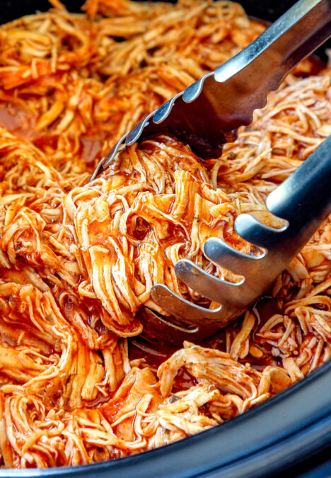 Easy Slow Cooker Shredded Mexican Chicken simmered with Mexican spices, salsa and green chilies for the BEST Mexican chicken perfect for tacos, burritos, tostadas, salads, etc. Couldn’t be any easier!