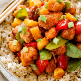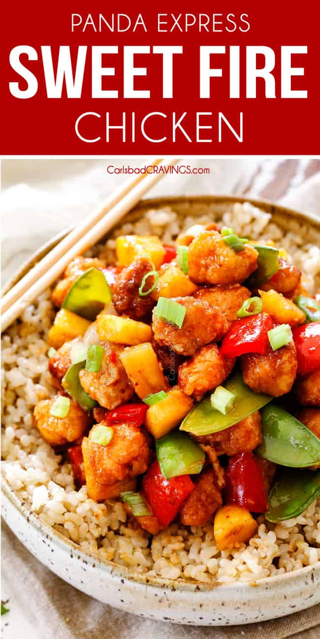 This Panda Express Sweet Fire Chicken Copycat is easy to make at home and on your table in just over 30 minutes! It can be pan fried OR baked and is loaded with crispy chicken, red bell peppers, onions, pineapple and a tangy, sweet and spicy chili sauce that will have you licking your plate.