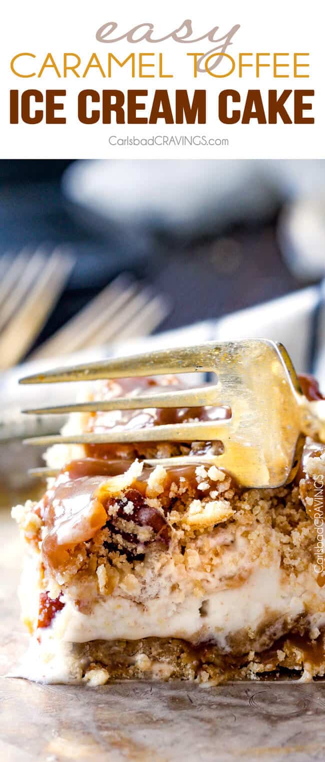 I first posted this Caramel Toffee Ice Cream Cake almost two years ago when I first started blogging and it needed a makeover because an Ice Cream Cake with toffee ice cream AND pecan cookie crumble AND caramel needs to be seen and made and devoured. An Ice Cream Cake that is so addicting that after I dropped a heaping section off at a friend’s house, she texted me, “Mmmmm…yum, yum, yumm! I’m fighting Rian over it as we speak!”