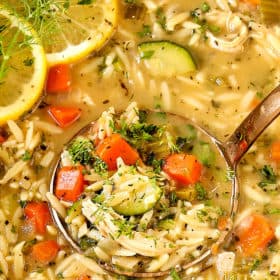 This lemon chicken orzo soup is refreshing, comforting, simple to make, nutritious and extremely versatile. It’s a one pot wonder loaded with everyday ingredients of juicy chicken, tender orzo, carrots, celery, and zucchini in a vibrant lemony broth laced with fresh dill and Parmesan. This lemon chicken orzo soup is also extremely versatile – swap the orzo for pasta, rice or lentils, the chicken for ground chicken or rotisserie chicken and the veggies for your favorites. This orzo soup also makes a great freezer friendly meal, just leave out the orzo and add it when you are ready to eat the soup. Serve your lemon chicken orzo soup with dinner rolls and salad for a complete feast!