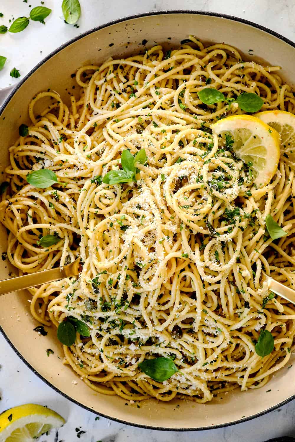 This is a quick and easy pasta recipe that’s flavored with layers of acid, aromatics, herbs and heat. The bright lemon is complemented by a few non-traditional additions of fresh herbs and salty capers which elevate this to quite possible the best lemon pasta recipe. But we’ll let your taste buds be the judge of that. Here’s what you’ll need to make lemon spaghetti: