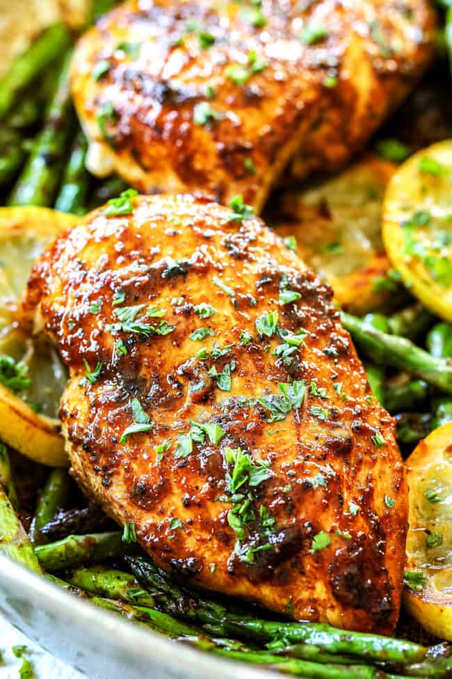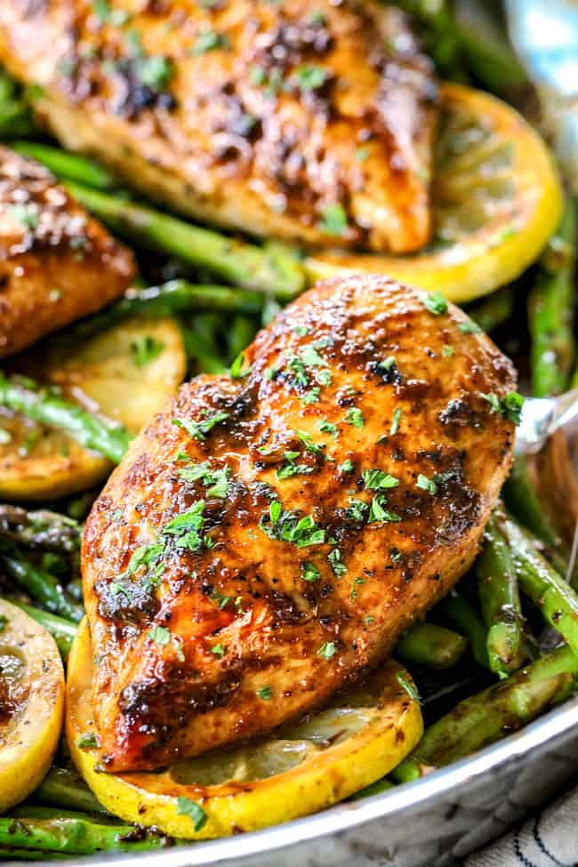 Lemon Pepper Chicken makes fabulous meal prep! To meal prep, slice chicken after its been resting for at least five minutes, this will allow the juices to be reabsorbed throughout the chicken. Equally divide chicken, asparagus and any renaming sauce between 4 airtight containers along with rice, pasta, etc.