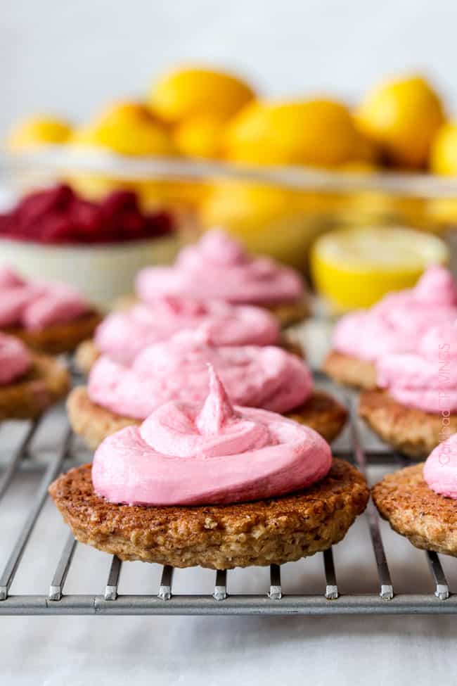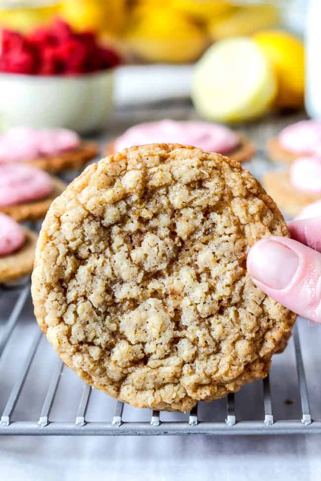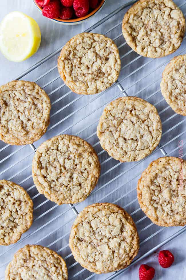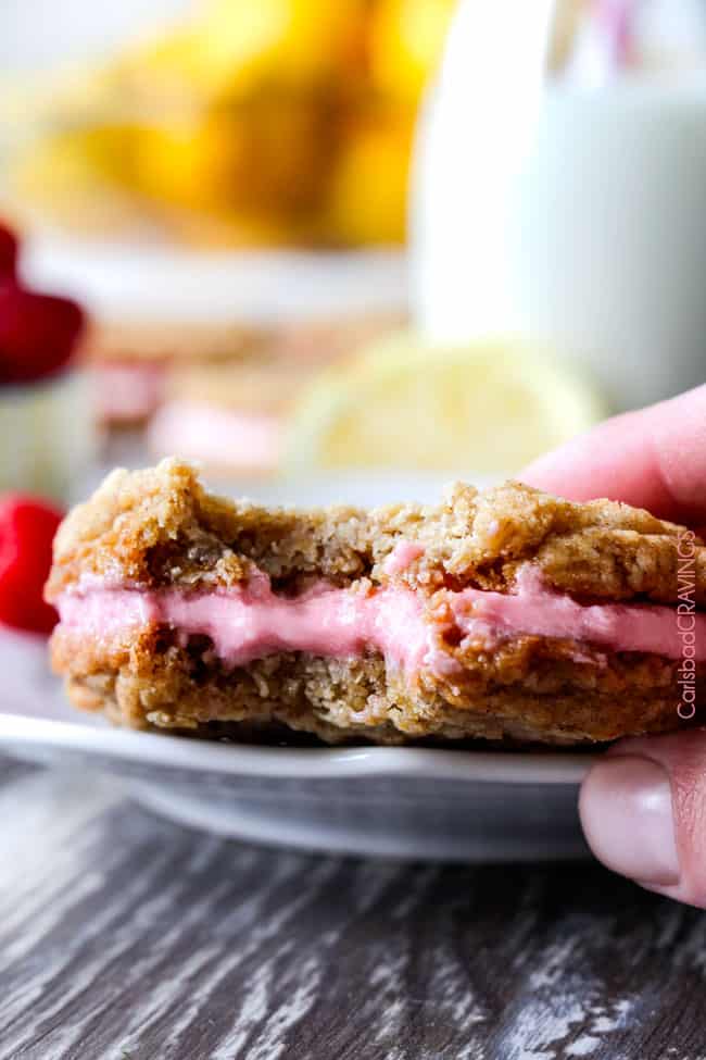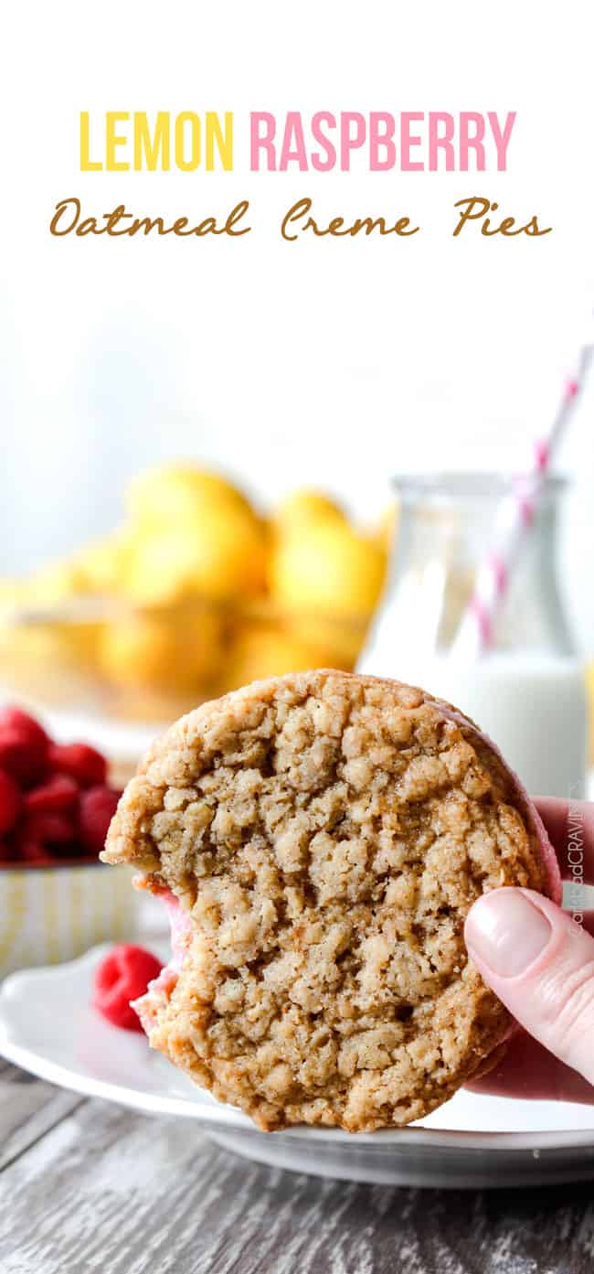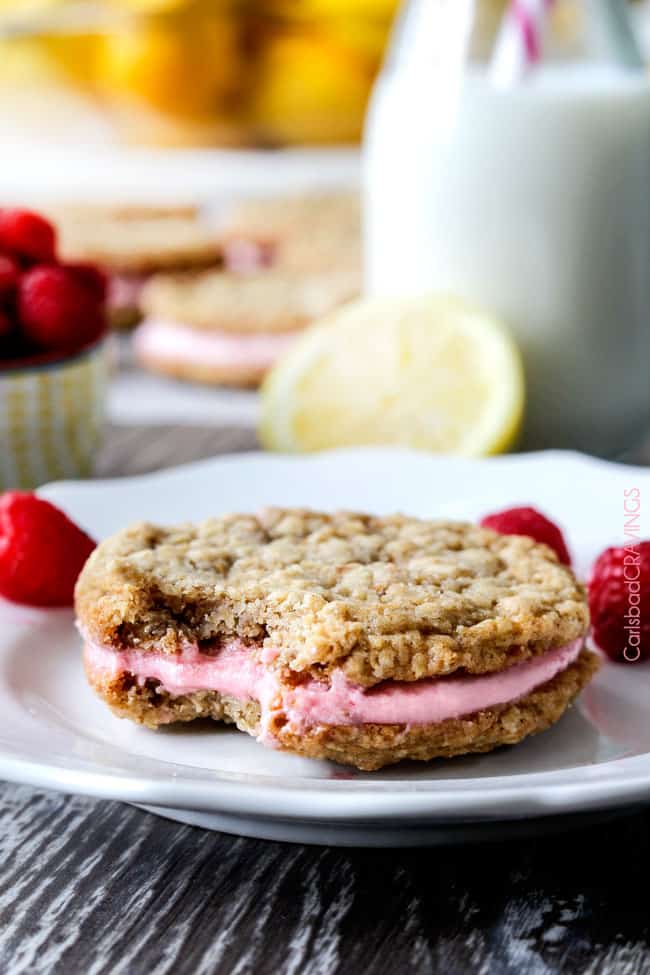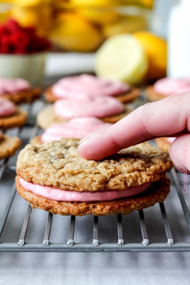 The spring/summer version of Little Debbies’ Oatmeal Creme Pies! Soft and chewy buttery lemon oatmeal cookies sandwiching creamy raspberry frosting.  The reason for raspberries.  And lemon.  And summer!