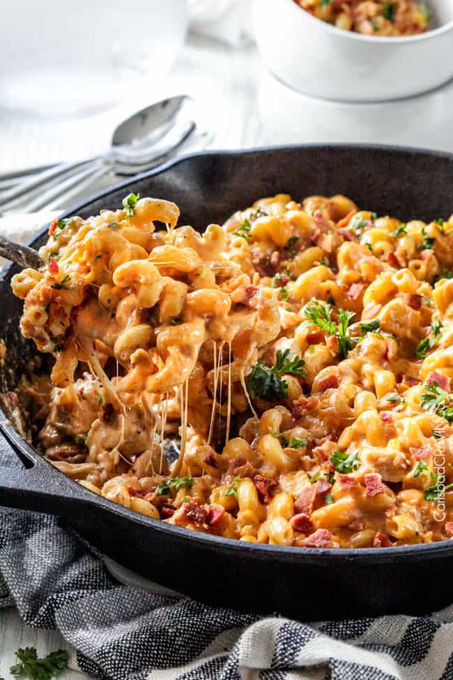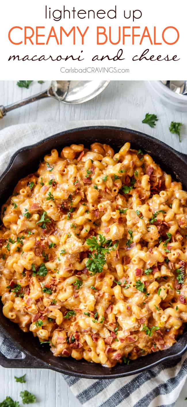 This Buffalo Chicken Mac and Cheese is so outrageously delicious, you’ll want to claim the entire skillet – and that’s okay because it is lightened up! This mac n’ cheese recipe has a secret ingredient in its creamy, cheesy buffalo sauce that helps make it lighter – it will blow your mind. Are you ready?