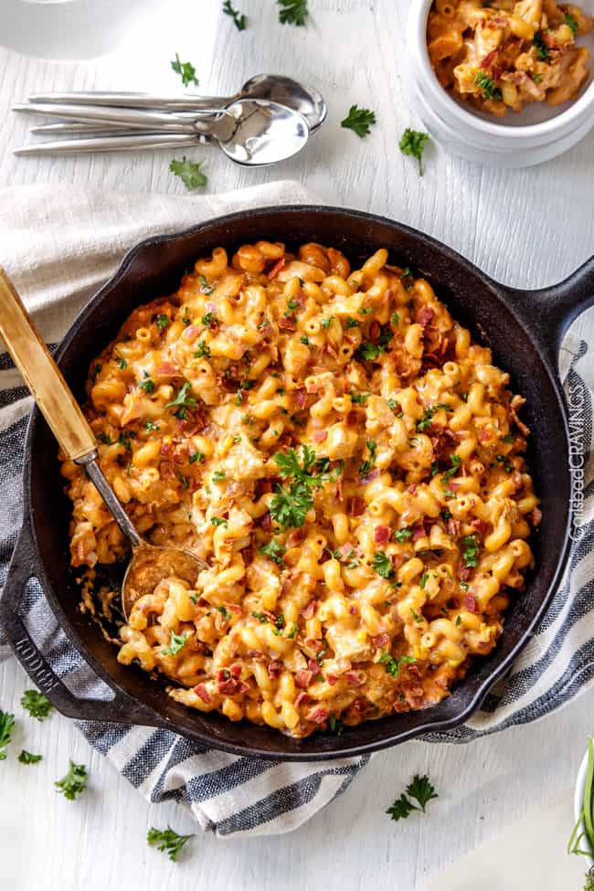 - Turn heat down to medium and stir in creamed corn, cream cheese, ½ cup milk, 2-5 tablespoons buffalo hot sauce (see note) and spices. Stir until cream cheese is melted, then stir in cheddar cheese and mozzarella cheese until melted. Add chicken, bacon, blue cheese and pasta and stir until evenly coated, adding additional milk if needed to reach desired consistency. Garnish with fresh parsley if desired.