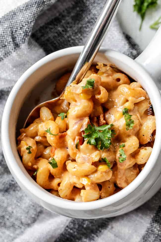 Instead of making a roux with butter/flour or using heavy cream, I use creamed corn! Its natural creaminess adds the perfect body to the sauce without adding any fat (okay, well 1 gram) – seriously life changing and soooo good! I use this secret in my Mexican Chicken Corn Chowder as well and it is epic.