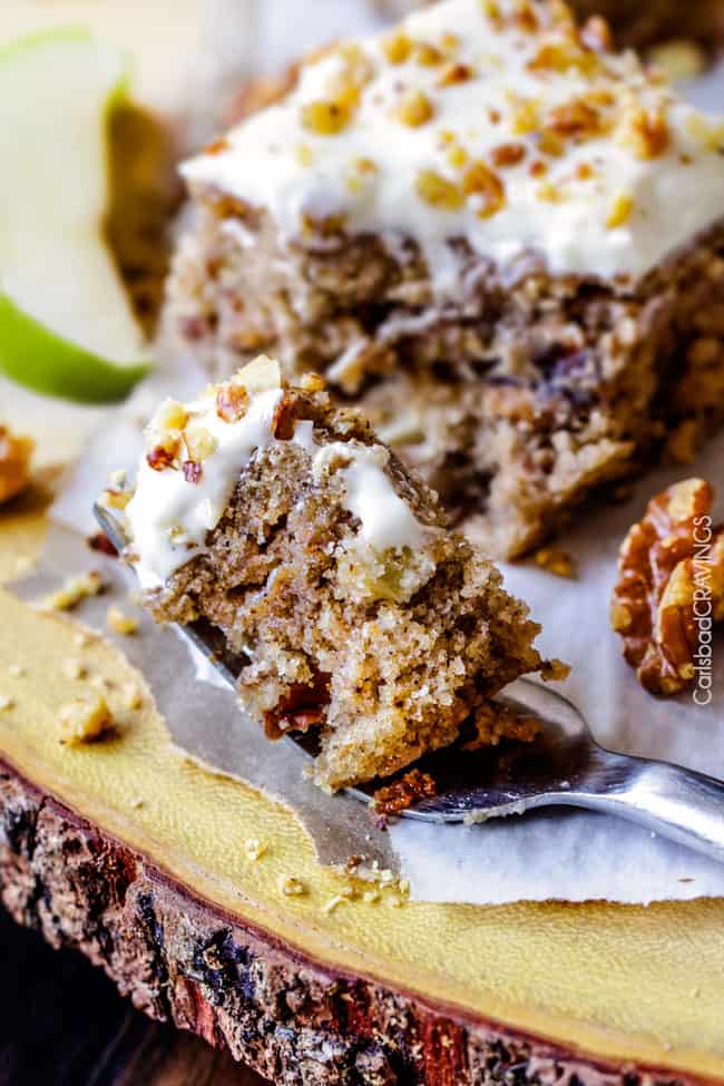 This cake is irresistible warm, right out of the oven, frosting-less (seriously, grab your fork!) and irresistible dressed up with Spiced Cream Cheese Frosting and a sprinkling of walnuts.