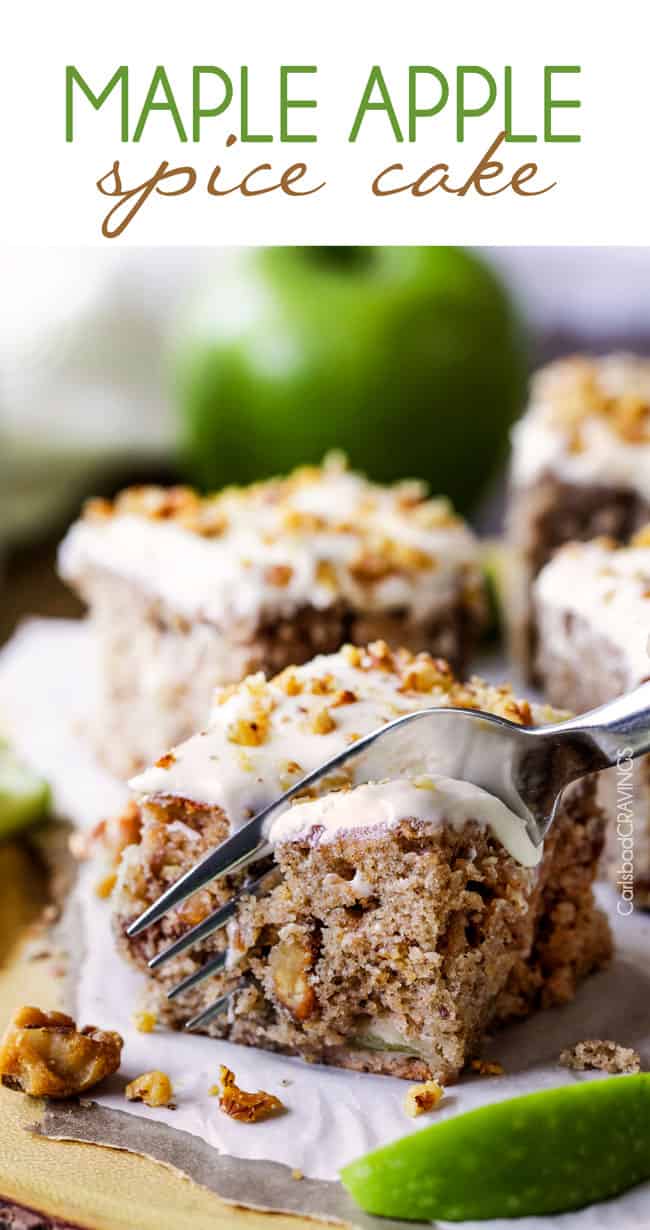 Super moist Maple Apple Spice Cake infused with sweet maple syrup, bursting with Fall spices, walnuts (optional) and smothered in silky cream cheese frosting. Everyone loves this cake!