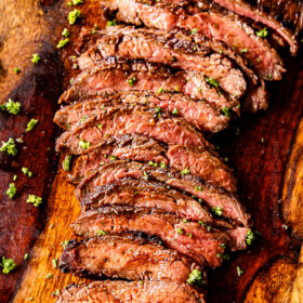This flank steak recipe will have everyone singing your praises, begging for the recipe and coming back for seconds and thirds. The flank steak marinade creates melt-in-your-mouth tender, juicy steak with complex savory, tangy, sweet and spicy notes. The marinade is made with soy sauce, balsamic, lemon juice, brown sugar and seasonings that infuse the steak with tons of flavor. And the best part of grilled flank steak? It’s SO easy with zero clean up! Marinate then grill – that’s it! (I’ve also included oven and stove top instructions.) Flank steak is also extremely versatile and can be served up with your favorite sides like mashed potatoes and fruit salad or in salads, wraps, pasta, sandwiches and more.