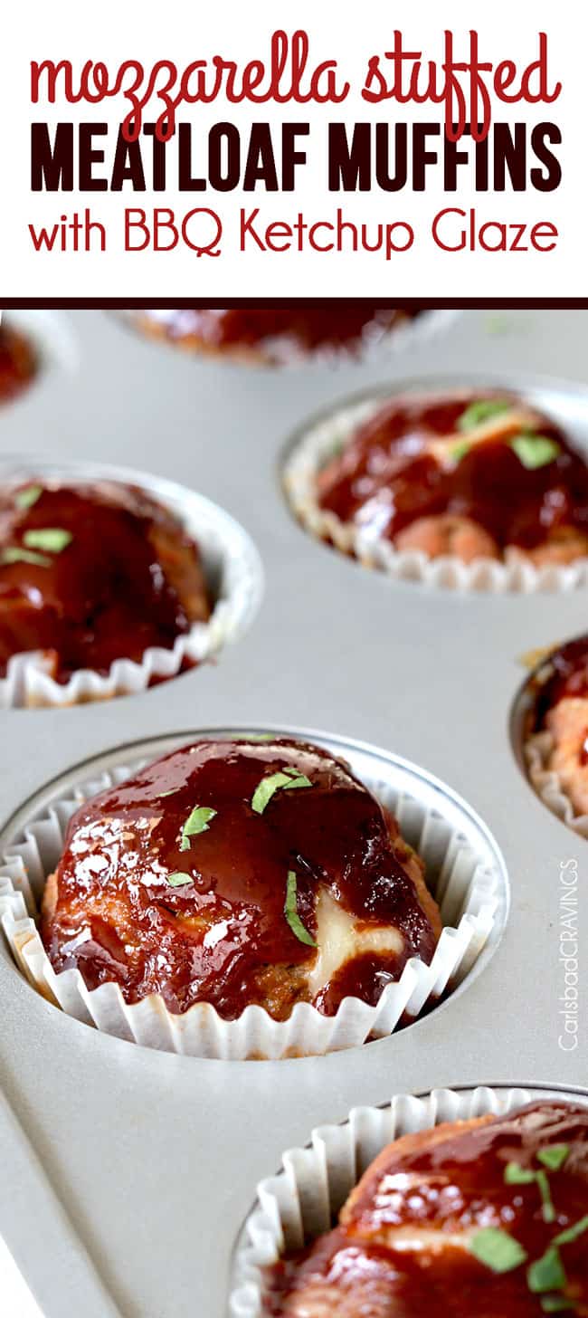 Mozzarella Stuffed Meatloaf Muffins – each bite a perfect proportion of moist, spiced BBQ Ketchup Glazed meatloaf that will have you craving “more meat!” “more meat!”