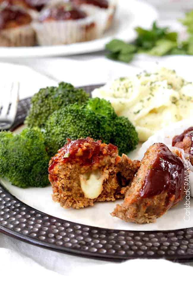 The cheese in these Meatloaf Muffins not only rewards you with an ooey gooey surprise, it helps the muffins cook more evenly because the beef is not as thick due to the cheese center.