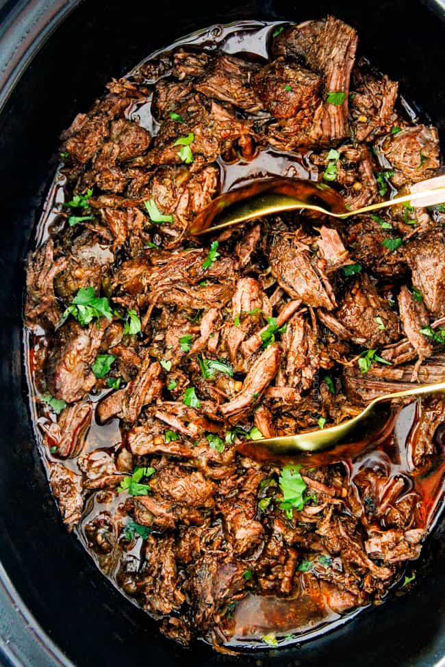- Beef Barbacoa (Crockpot): crazy juicy beef slow cooked until melt-in-your-mouth tender infused with a tangy, chipotle sauce spiked with cumin, oregano and lime juice – one of my favorites of all time!