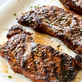 - New York Strip Steak: the recipe calls for 2 steaks, but you can scale the number up or down by using the arrows next to the servings in the recipe card depending on your needs. This will automatically scale the seasonings/butter measurements.