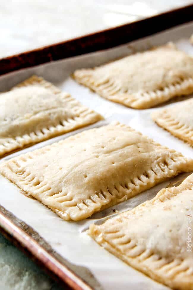 When ready to bake, brush the tops of each pastry with remaining egg wash. This will promote that golden goodness. Bake at 350 degrees F for 25-30 minutes or until lightly golden, rotating once while baking. Let pop tarts cool for 5 minutes then transfer to a wire rack to cool completely before glazing.