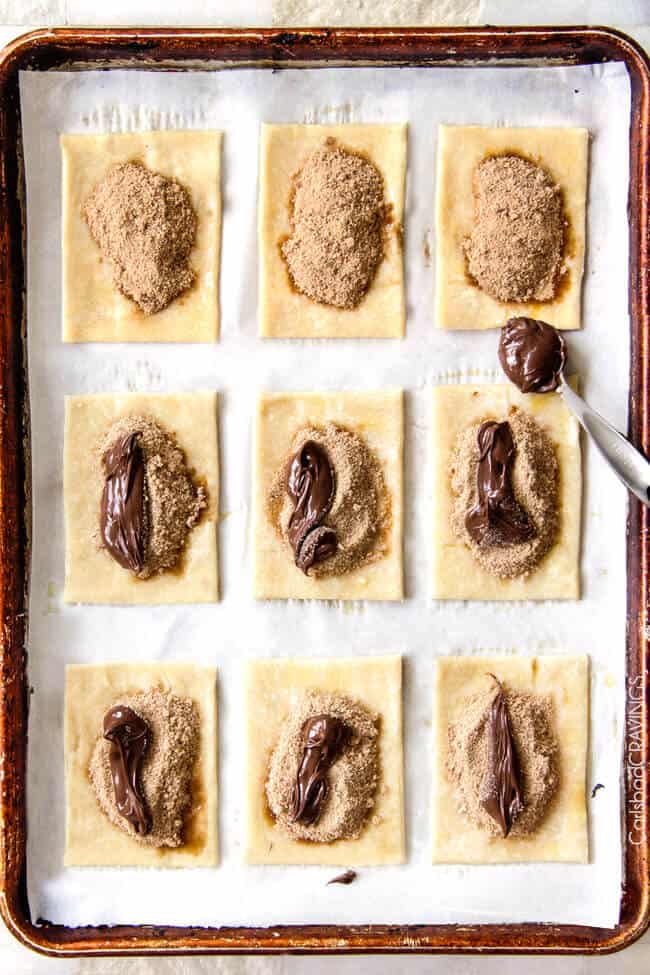 - Filling: To these rectangles, brush egg wash over all of the edges. In a small bowl, whisk together the brown sugar, cinnamon and flour then spread down the center of each rectangle leaving at least a 1/2-inch dough perimeter. Top each brown sugar center with 1 teaspoon Nutella down the center (it will spread more when baked).