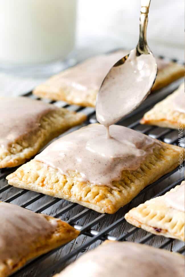 - Glaze: Meanwhile, whisk together all of the Glaze ingredients until smooth, adding a teaspoon more milk at a time if needed to reach spreadable consistency. When pop tarts are cool, spread Glaze over the top. Glaze will begin to harden after 30 minutes, but I can never wait that long. Store in an airtight container.
