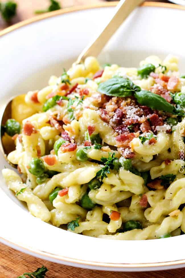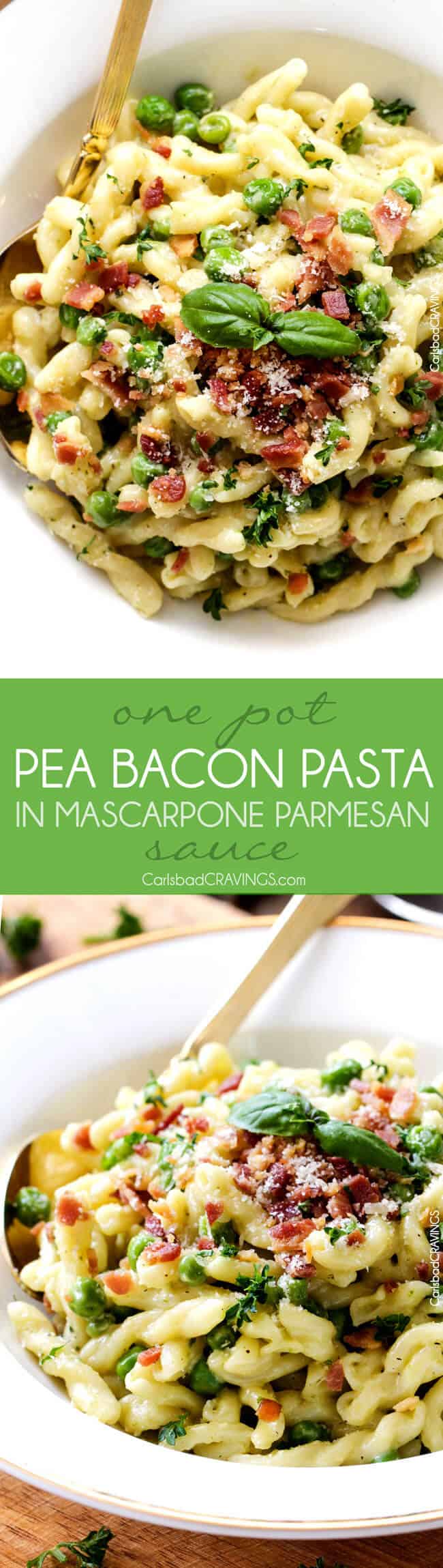 Is it Easter yet? I love holidays not only for the chance to get together with family but also for the chance to reunite with long lost taste bud calorie splurges AKA this AH-Mazing One Pot Pea and Bacon Pasta in Mascarpone Parmesan Sauce! Because holidays are meant to indulge and because you sharing and receiving rave reviews for your pasta means you won’t eat the WHOLE POT- which is probably a good thing – but you will be secretly bemoaning your benevolence with one bite of Bacon Pea Pasta. So maybe you want to make this pasta before Easter too? and during and after…