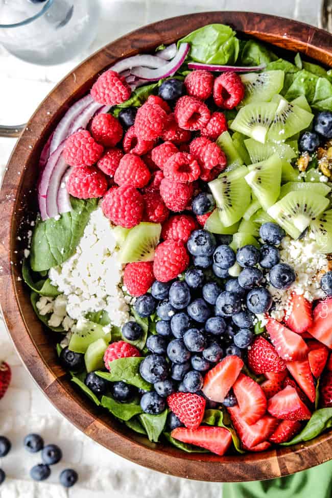 Fresh Berry Salad is one of the BEST fruit salads you will ever make! Smothered in sweet and tangy, incredibly creamy Honey Mascarpone that takes minutes to whip up and tastes incredible! Perfect for brunch, barbecues and all your pool side parties!