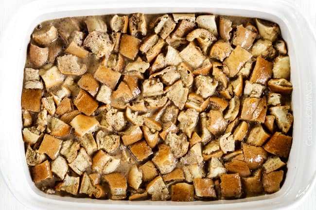 - Dry out bread: I cut my bread into cubes when I first buy it, then let the bread dry out on my counter that day then make my French Toast Casserole the following night.