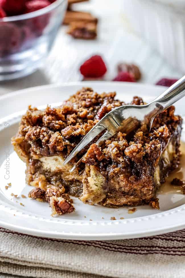 - Evenly sprinkle Brown Sugar Pecan Crumble over the bread and bake at 350 F degrees for 45-55 minutes, depending on how soft/”eggy” you like it. Serve with fresh berries and syrup if desired.