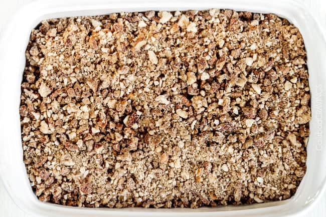- Make topping. This Brown Sugar Pecan Crumble makes this Eggnog Baked French Toast Casserole. Please don’t skip it or you will be majorly depriving you and your loved ones of heavenly bites of what could have been. The Brown Sugar Pecan Crumble is a simple mixing of pecans, maple syrup and vanilla, then in your food processor you pulse together brown sugar, flour and butter and more holiday spices – combine the two for a sweet, maple infused pecan crumble that toasts to golden perfection in the oven and tastes like sweet perfection in your mouth.