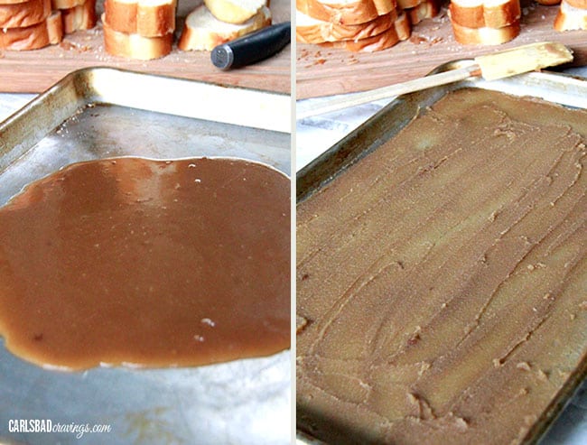 - Use brown sugar/butter mixture immediately. After you melt the butter and brown sugar, immediately pour it onto the jelly roll pan or it will thicken as it cools and become less spreadable. This means you want your jelly roll pan greased and ready to go before you melt the brown sugar/butter.