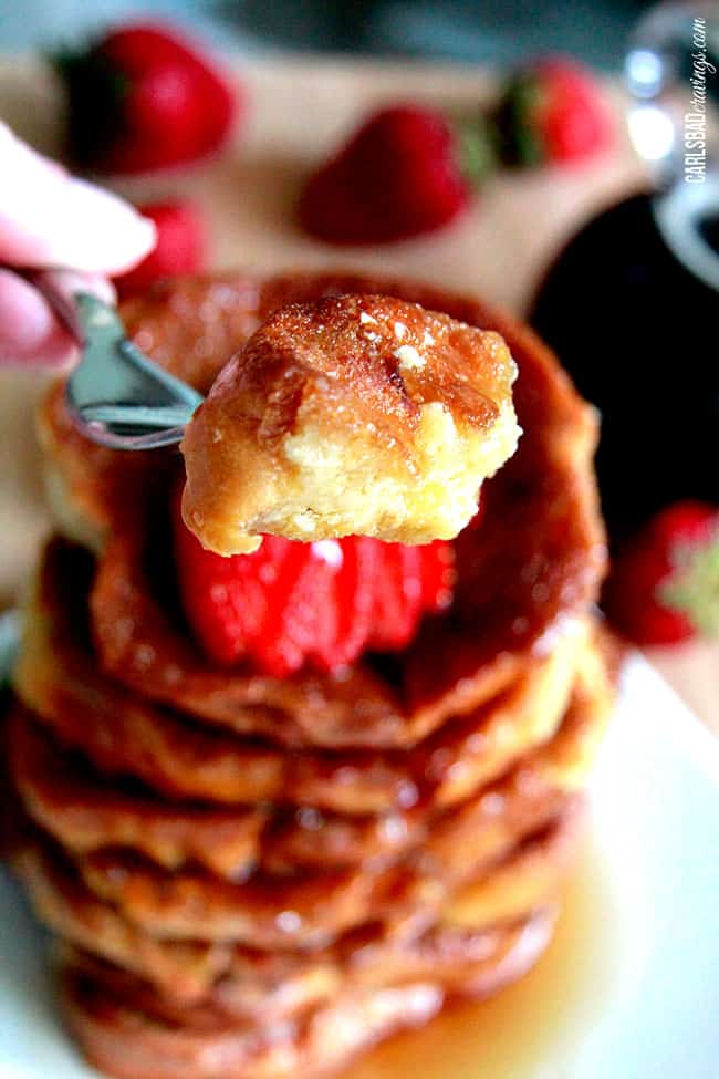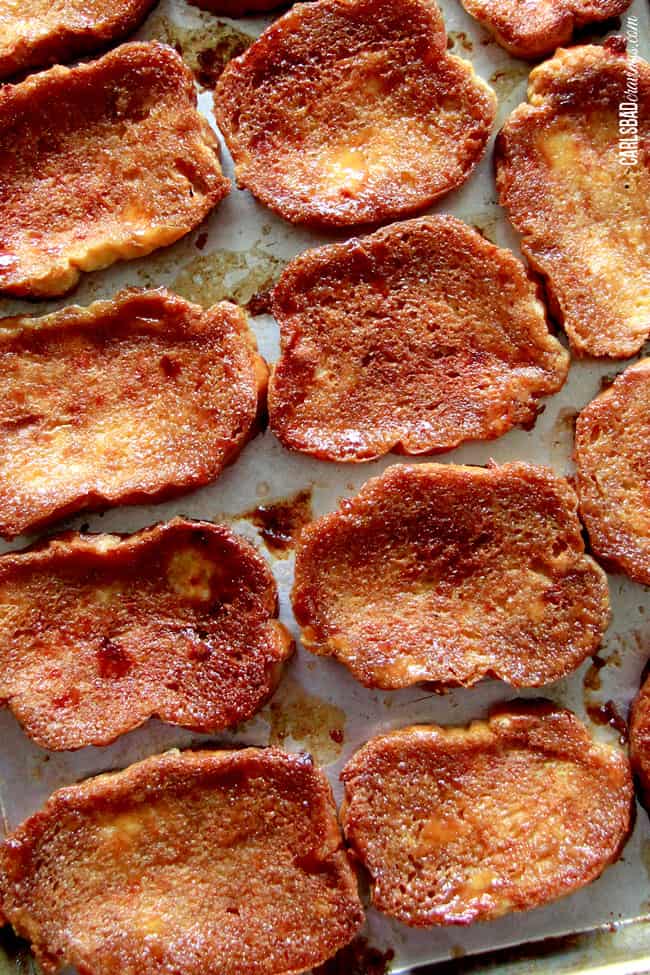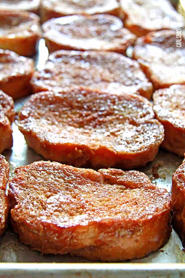I made a few simple changes to the Six Sister’s Stuff version that resulted in OUT-OF-THIS-WORLD Creme Brulee French Toast. I eliminated the corn syrup, added maple syrup, added orange extract (to mimic the liquor flavor), flipped the toast after baking then broiled them to completely caramelize the top. When I actually shoved a mountainous forkful into my mouth, my eyes grew wide at how much it actually tasted like glorious Creme Brulee!