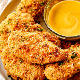 You can also cook your Parmesan crusted chicken in the air fryer, simply follow the recipe then air fry instead of bake. This method is a little more tedious, however, because you can’t fit as many chicken tenders in the air fryer. I prefer the oven method to make the breaded chicken tenders and reserve the air fryer for warming leftovers.