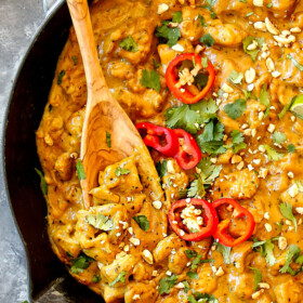 This easy Peanut Butter Chicken recipe is a QUICK one-skillet dinner that’s huge on flavor, low on effort and belongs in your easy weeknight dinner arsenal. It’s loaded with tender, juicy chicken swimming in the most intoxicating, lusciously creamy, wonderfully fragrant, comforting peanut sauce infused with garlic, ginger, basil, lime juice and coconut milk. This Peanut Sauce Chicken also earns major points because it’s made with 100% pantry friendly ingredients – even the aromatics are powders! You can enjoy this Peanut Butter Chicken plain or add in any desired veggies you have on hand. Serve Peanut Butter Chicken over rice, cauliflower rice, zoodles, sweet potatoes, etc. loaded with contrasting mangos or pineapple and let your eyes roll back with each sublimely satisfying bite.