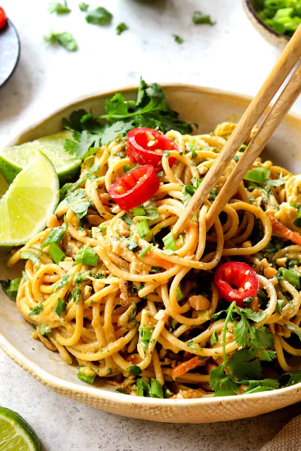 Thai food is my absolute favorite cuisine! I love creating Thai food at home such as Pad Thai, Drunken Noodles, Pad See Ew, Red Curry Chicken, Panang Curry, Green Curry, Yellow Curry, Tom Kha Gai, Chicken Satay and now these Thai Peanut Noodles!
